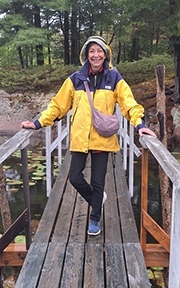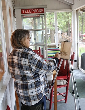 It was a wet and nasty day, so Beth found some shelter in the Memquisit Lodge porch to paint.