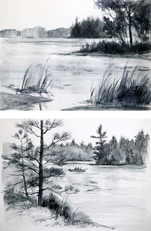 A couple of my tonal studies using watercolour pencil and wash from the workshop and 12 X 16 acrylic on canvas board titled: Burkey’s Favorite, Lake Nipissing.