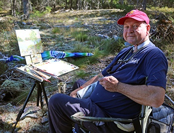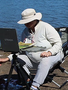 Anne Marvin savouring the sunshine finds her comfortable spot, locates her subject, and focuses on her watercolour painting on day one. Days to follow weren’t so sunny. Oh well, that’s plein air! |