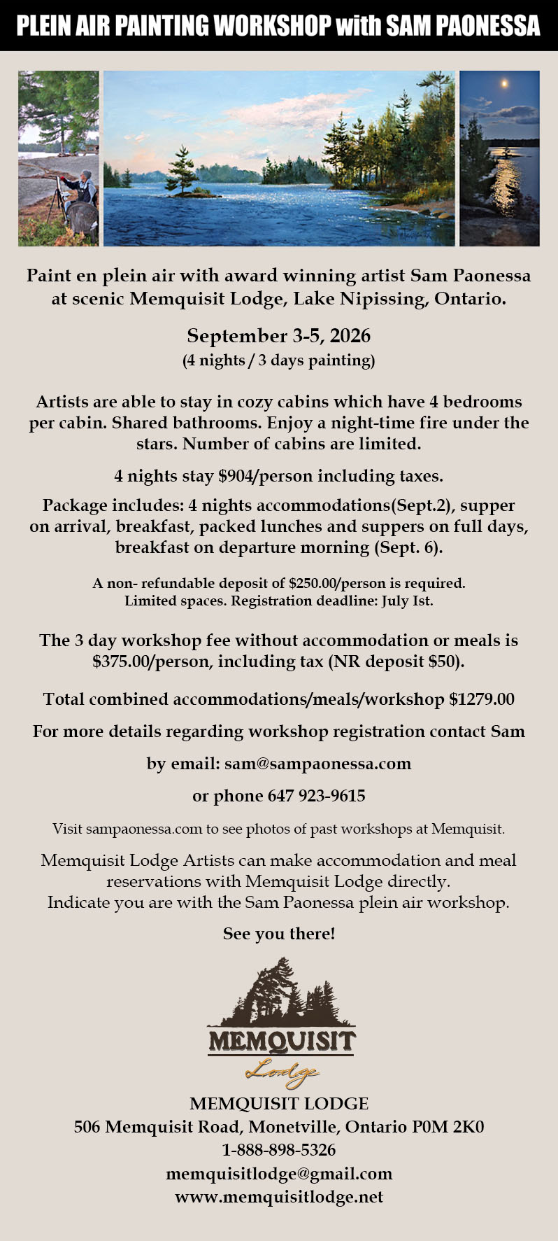 This plein air painting course will provide students with the challenges of outdoor painting focusing on the core principles of composition, value, colour and edges. Student should have some experience and be able to carry their materials a short distance to the site. Sam will demonstrate each day, sharing his plein air painting techniques using traditional and less tradition tools in a fun and friendly environment.