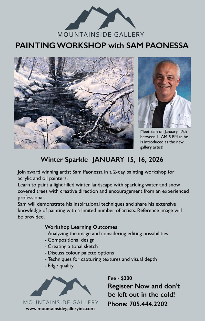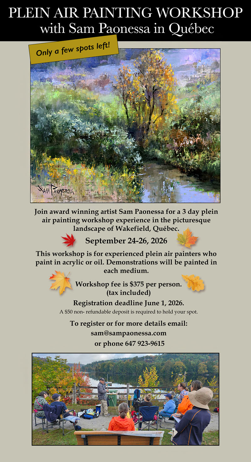 Sam Paonessa is a professional, award winning artist who has enjoyed a creative career for over 40 years. His interest remains with plein air landscapes and he is a founding member of Plein Air Canada.